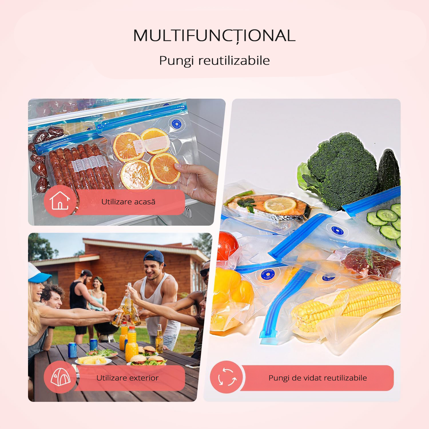 Pachetul include 15 pungi de vidat reutilizabile, realizate din materiale de calitate alimentara, sigure pentru depozitarea alimentelor. Designul impermeabil al pungilor permite reutilizarea acestora dupa spalare.