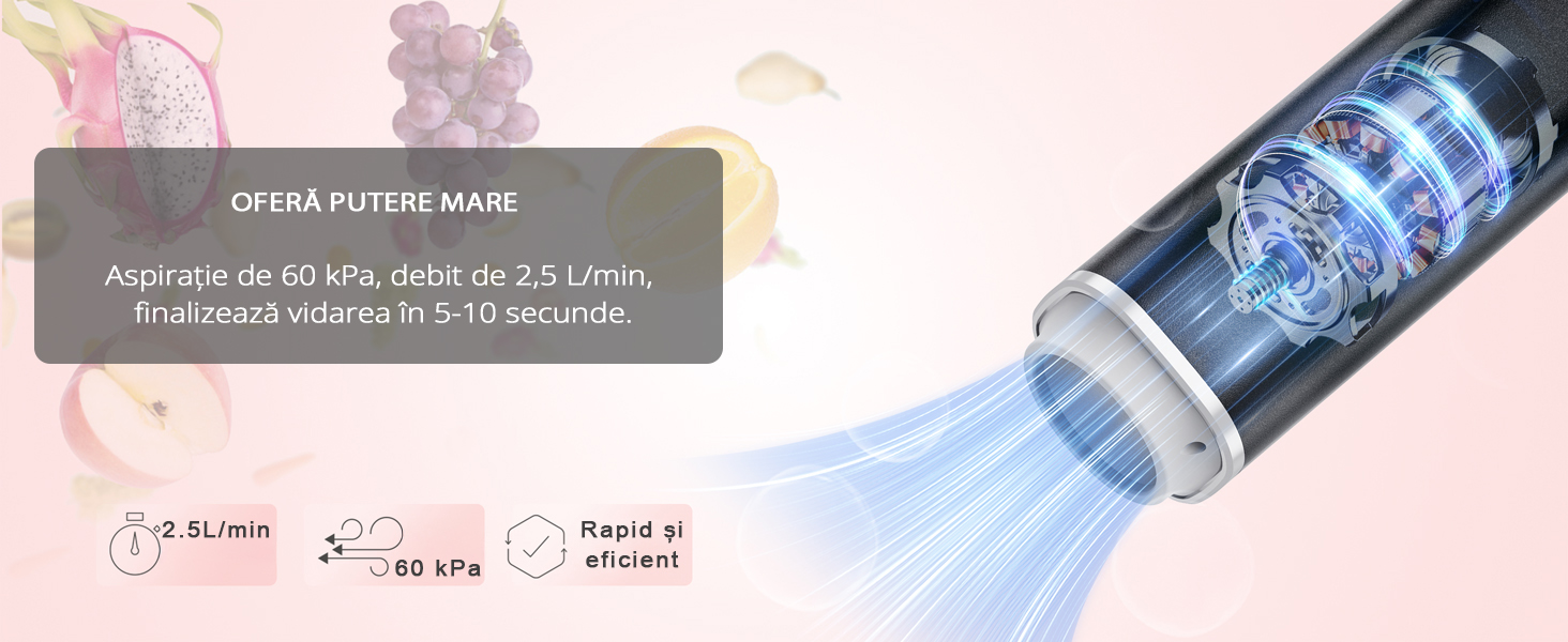 Echipat cu un motor puternic, PMP-01 genereaza o presiune de pana la 60 kPa, oferind o viteza de vidare impresionanta de 2,5 L/min. Finalizeaza procesul de vidare in doar 5-10 secunde, economisind timp si energie.