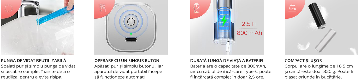 Dotat cu un acumulator reincarcabil de 800 mAh, aparatul asigura performanta de lunga durata. Se incarca complet in doar 2,5 ore prin cablul Type-C inclus, oferind eficienta maxima la fiecare utilizare.