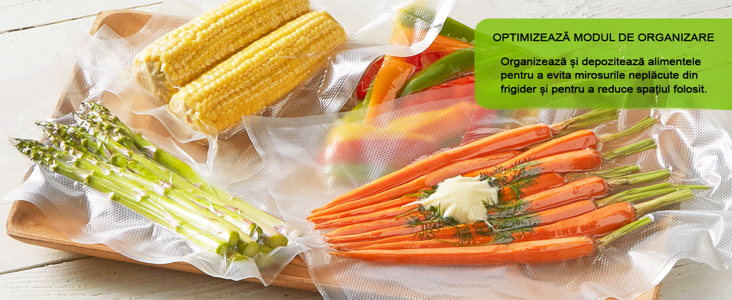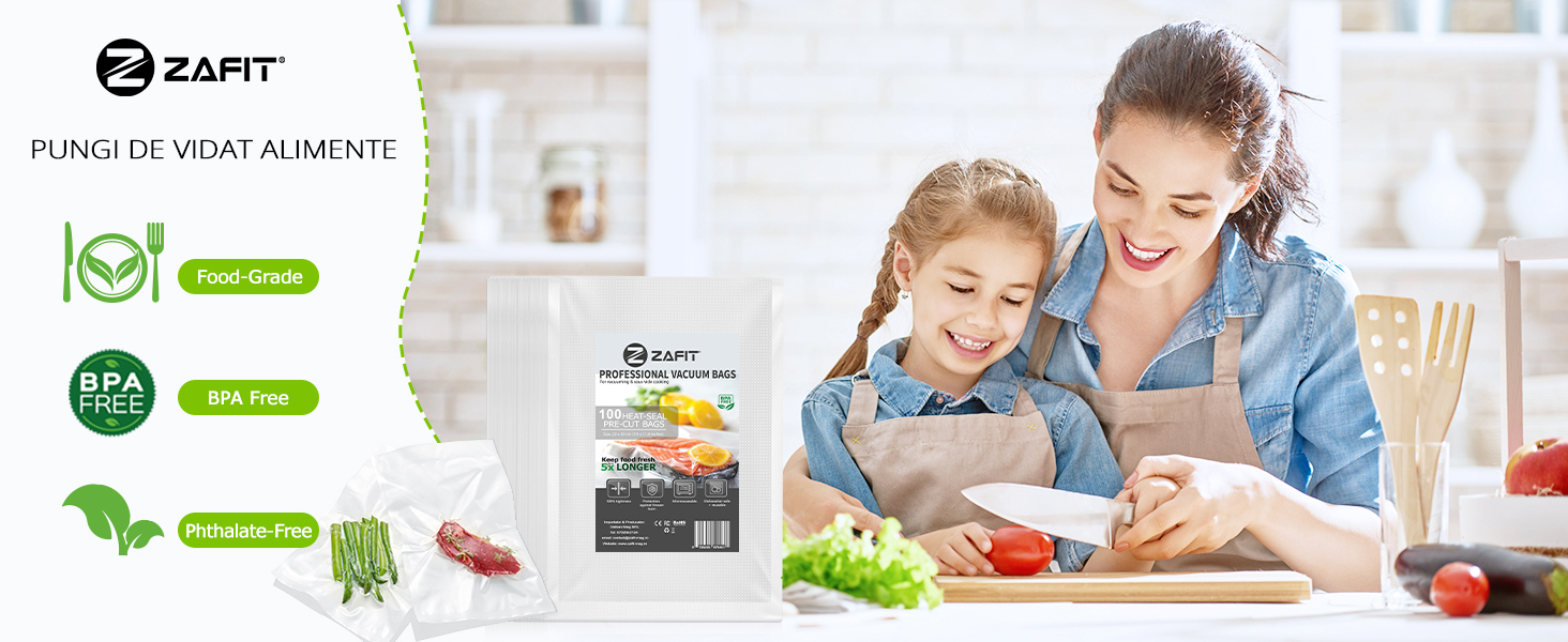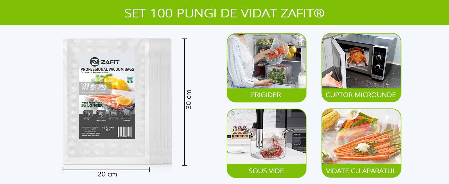 Alege pachetul ZAFIT™ cu 100 saci de vidat (20 cm x 30 cm), cu care poti sa videzi, sigilezi si resigilezi carne, legume, peste sau multe alte alimente.