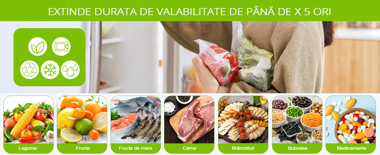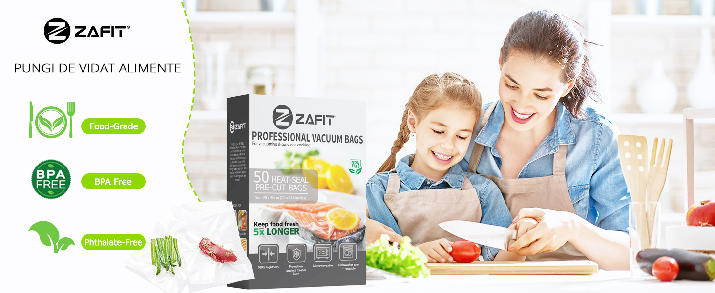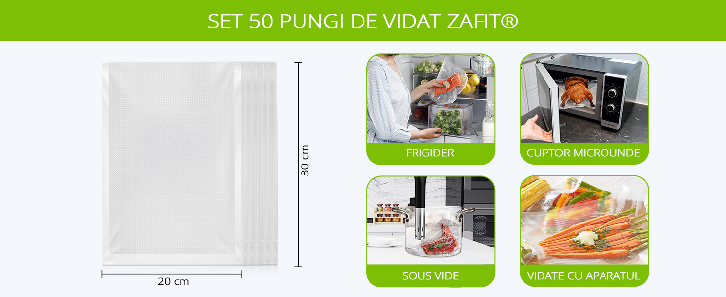 Alege pachetul ZAFIT™ cu 50 saci de vidat (20 cm x 30 cm), cu care poti sa videzi, sigilezi si resigilezi carne, legume, peste sau multe alte alimente.