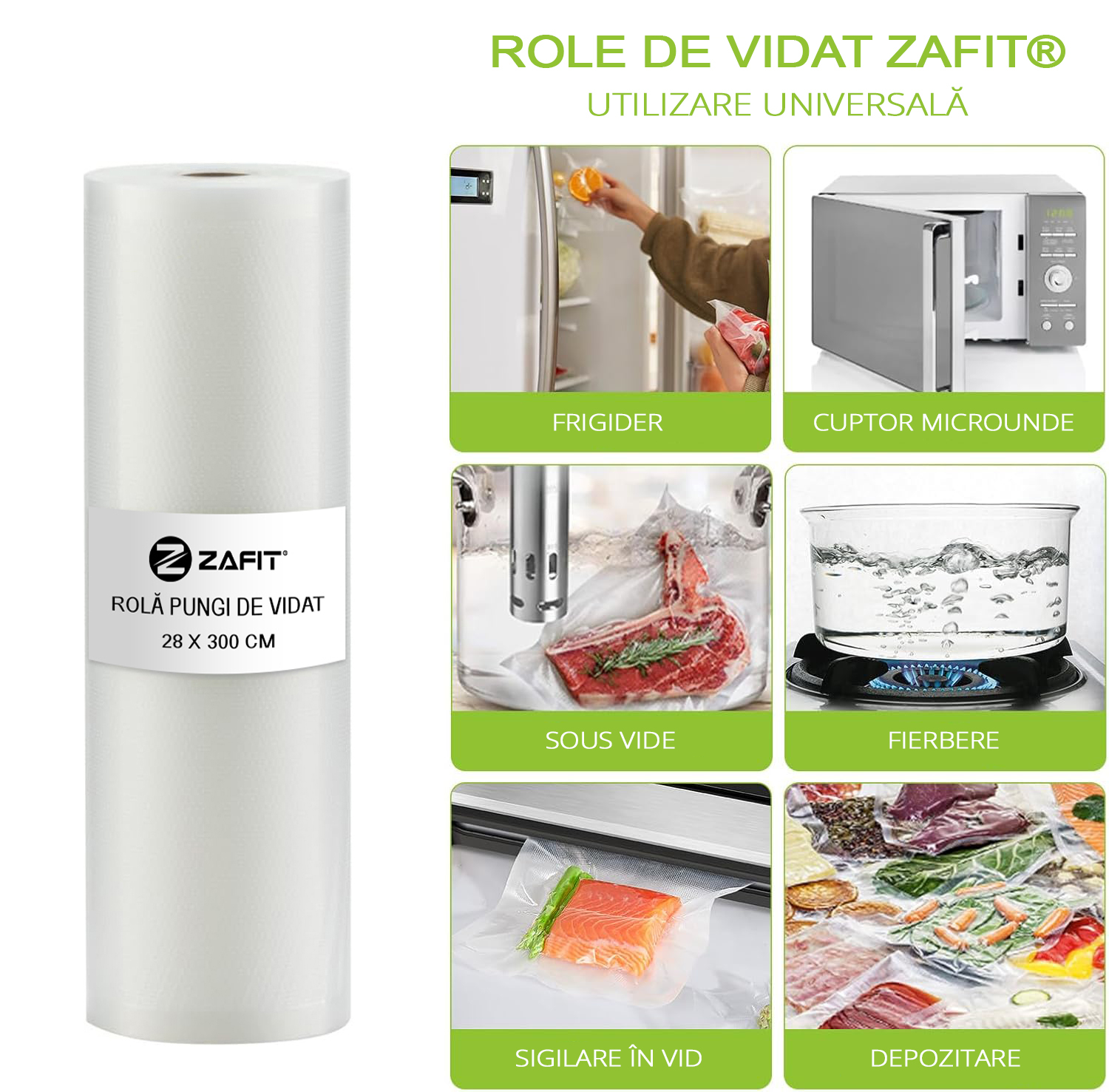 Alege Set 4 role pungi de vidat gofrate ZAFIT™, 28 x 300 cm, pentru aparat de vidat alimente, reutilizabile, rezistente, sous vide, lavabile in masina de spalat, fara BPA, transparent, cu care poti sa videzi, sigilezi si resigilezi carne, legume, peste sau multe alte alimente.
