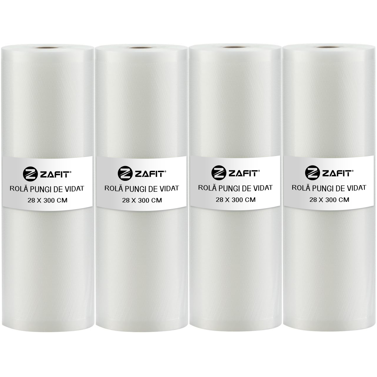 Set 4 role pungi de vidat gofrate ZAFIT™, 28 x 300 cm, pentru aparat de vidat alimente, reutilizabile, rezistente, sous vide, lavabile in masina de spalat, fara BPA, transparent