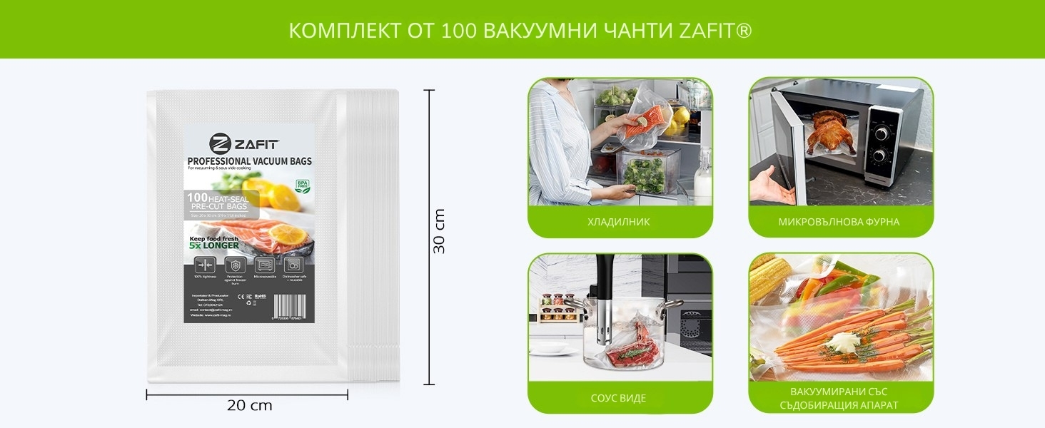 Избери комплекта ZAFIT™ с 100 вакуумни плика (20 см x 30 см), с които можеш да вакуумираш, запечатваш и повторно запечатваш месо, зеленчуци, риба и много други храни.
