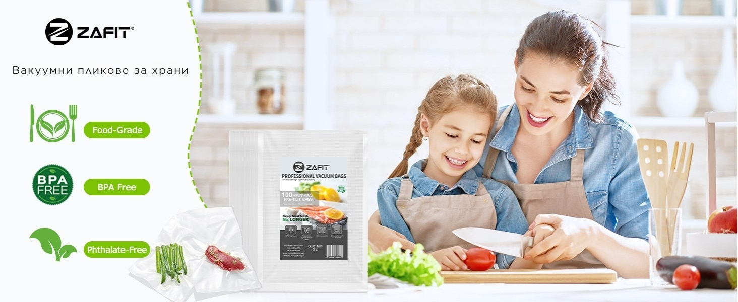 Чрез вакуумиране въздухът и влагата не проникват в храната, а хранителните вещества, вкусът и свежестта се запазват до пет пъти по-дълго от традиционните методи за съхранение. Освен това с вакуумните пликове ZAFIT™ предотвратяваш измръзванията в камерата.