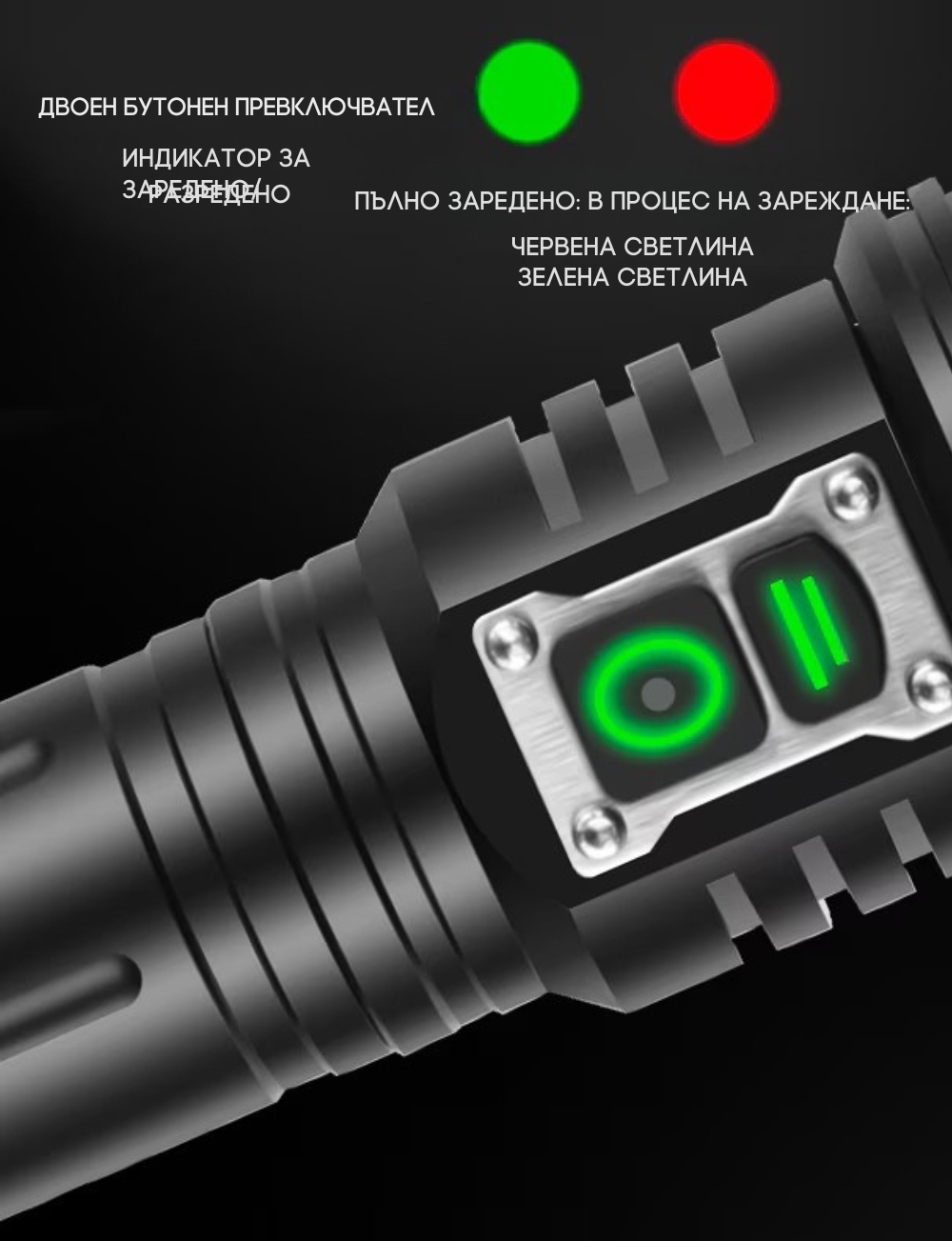 Наслади се на свободата на бързо и ефективно зареждане с помощта на включената батерия 26650 Li. Тази модерна технология ти позволява да се наслаждаваш на дълготрайно осветление, без да се тревожиш за постоянното подмяна на батериите.