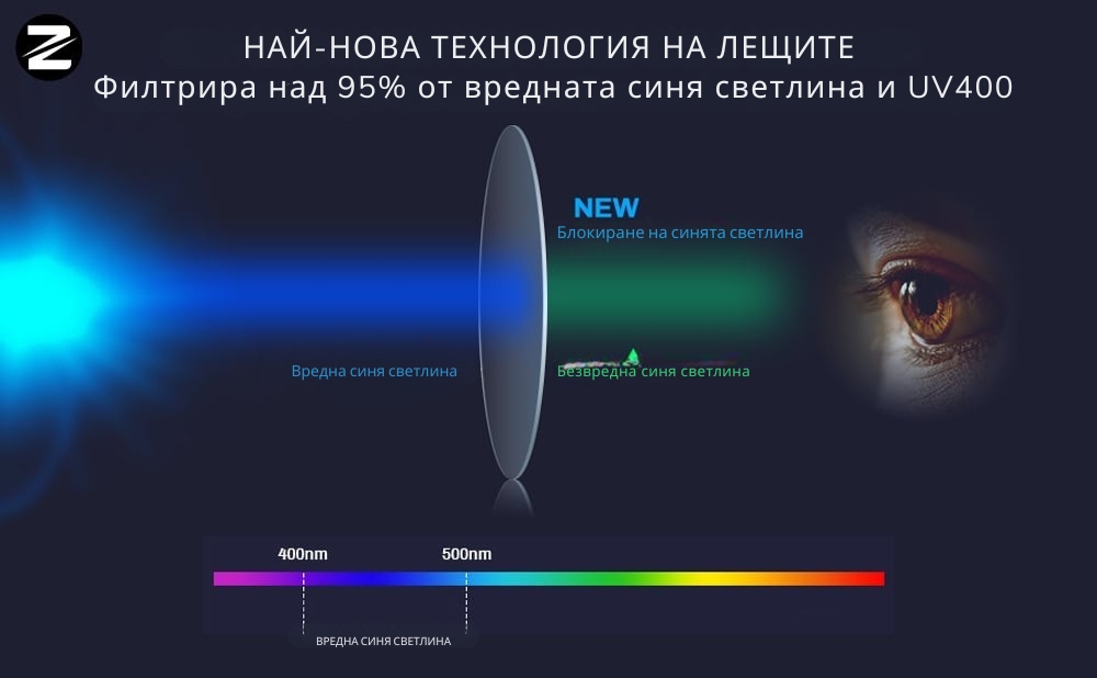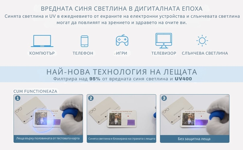 UV защита – Лещите против синя светлина използват специална американска технология за обработка на субстрата, която защитава очите от ултравиолетовите лъчи и блокира UV400.