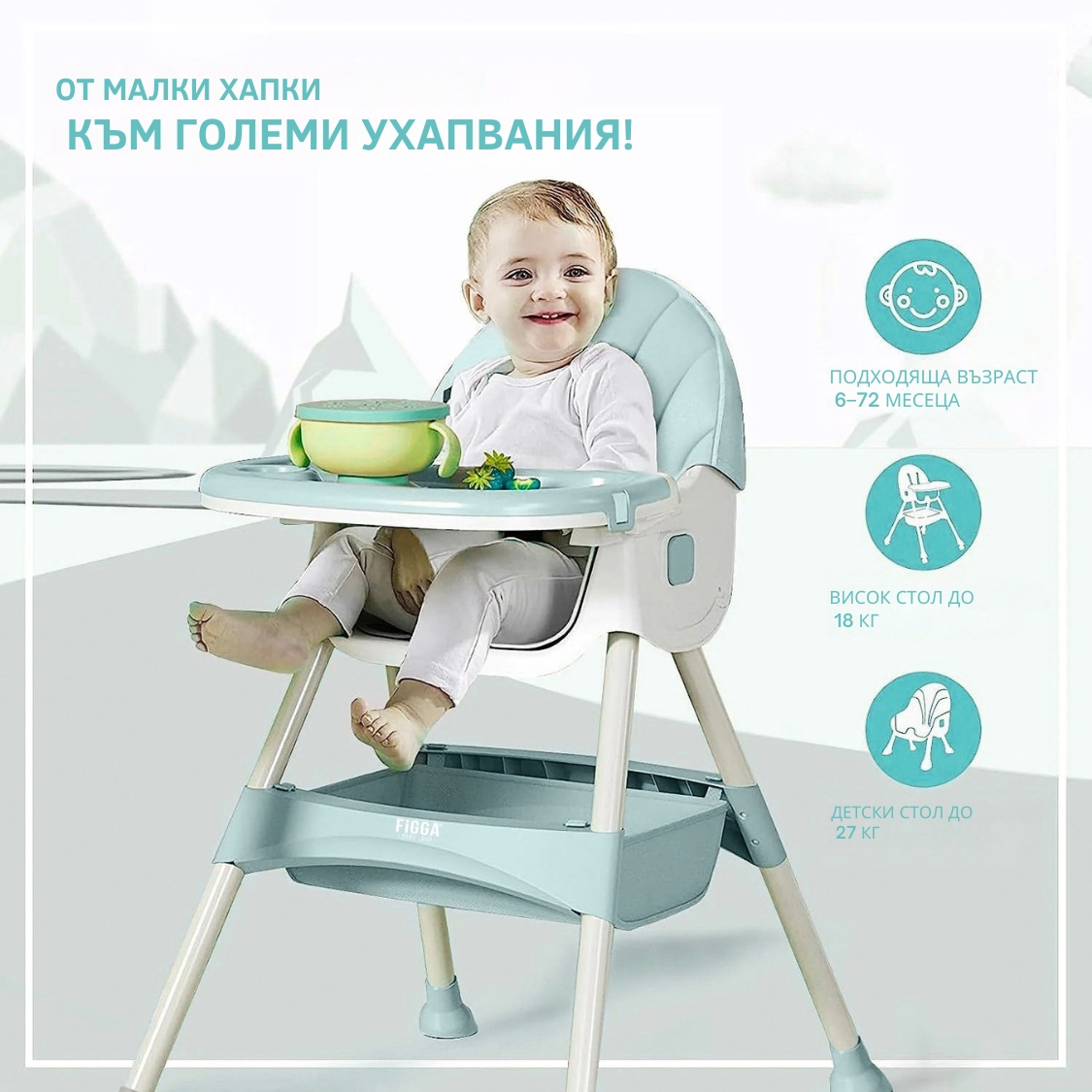 Осигурете комфорт и безопасност на вашето дете при всяко хранене със столчето за хранене 4 в 1 FiGGA®, предназначено за деца от 6 до 72 месеца.
