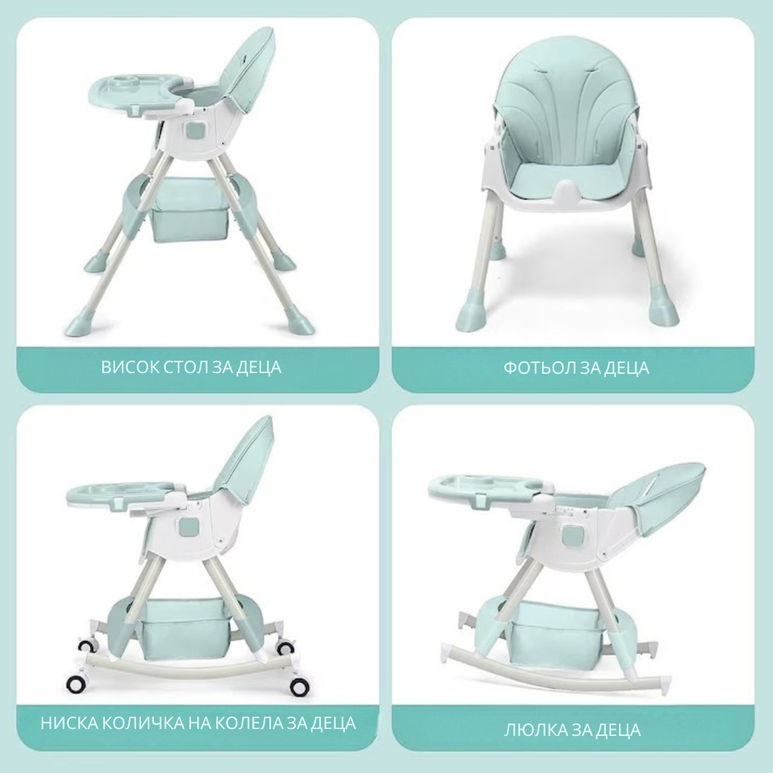 Проектиран да служи като стол за хранене, висок стол, люлка и релакс стол, предлагайки множество възможности за комфорт и нуждите на детето.