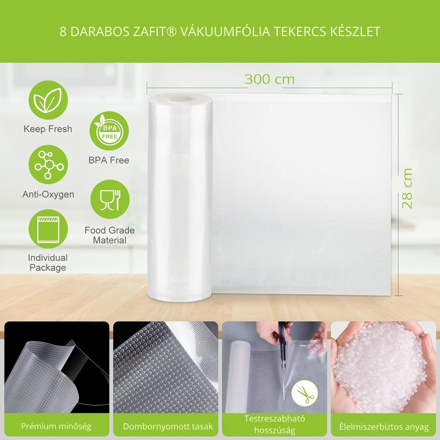 4 darabos ZAFIT™ vákuumtasak tekercs szett, 28 x 300 cm, vákuumfóliázó géphez – újrahasználható, strapabíró, sous vide kompatibilis, mosogatógépben mosható, BPA-mentes, átlátszó