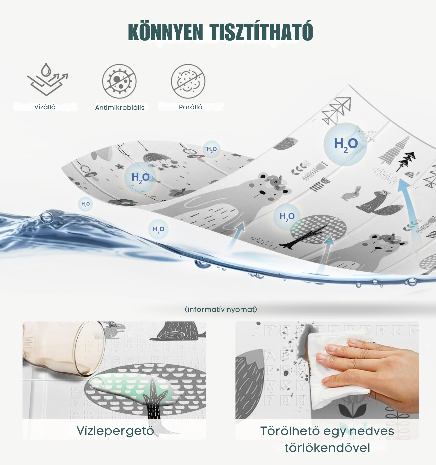 Ez a szőnyeg azonban sokkal több, mint egy egyszerű hőszigetelő szőnyeg. Oktató jellegű, figyelemfelkeltő képekkel van ellátva: aranyos állatokkal, színes számokkal és betűkkel, valamint élénk színű növényekkel. Ezek az oktató elemek elősegítik a kognitív fejlődést és ösztönzik a gyermek kíváncsiságát.