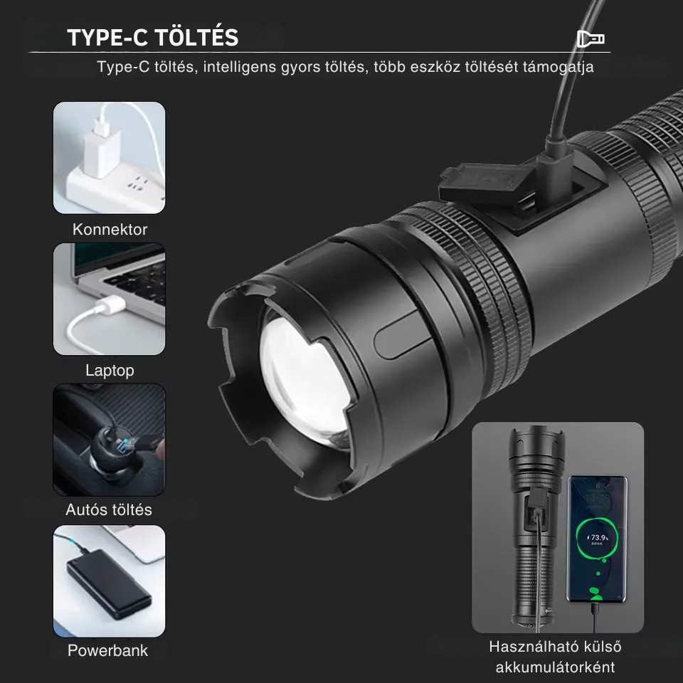 A Type-C töltőportnak köszönhetően a zseblámpa gyorsan és egyszerűen tölthető. Időt takarítasz meg, és élvezheted a készülék előnyét, amely a lehető legrövidebb idő alatt használatra kész.