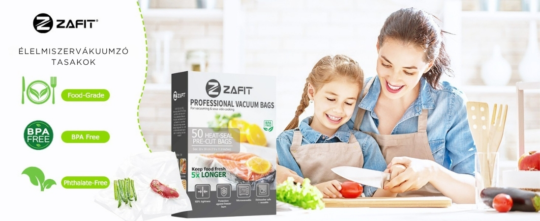 A vákuumozás használatával a levegő és a nedvesség nem jut be az élelmiszerbe, és a tápanyagok, az íz és a frissesség akár ötször tovább megőrződik, mint a hagyományos tárolási módszerekkel. Emellett a ZAFIT™ vákuumtasakokkal megakadályozhatod a fagyási égéseket a fagyasztóban.