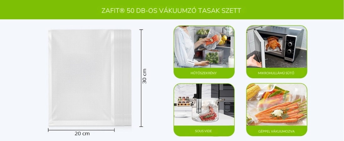 Válaszd a ZAFIT™ 50 darabos vákuumtasak csomagot (20 cm x 30 cm), amellyel vákuumozhatsz, lezárhatsz és újrazárhatsz húst, zöldségeket, halat vagy sok más ételt.