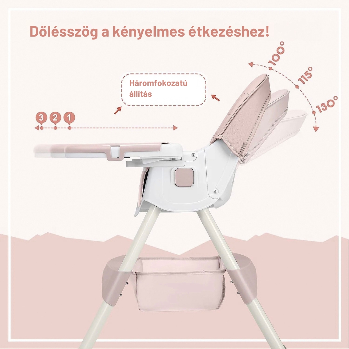 Úgy tervezték, hogy étkezőszékként, magas székként, hintaszékként és pihenőszékként szolgáljon, több lehetőséget biztosítva a gyermek kényelméhez és igényeihez.