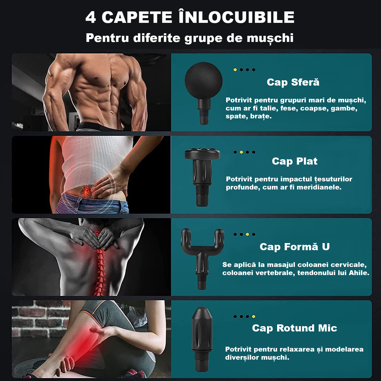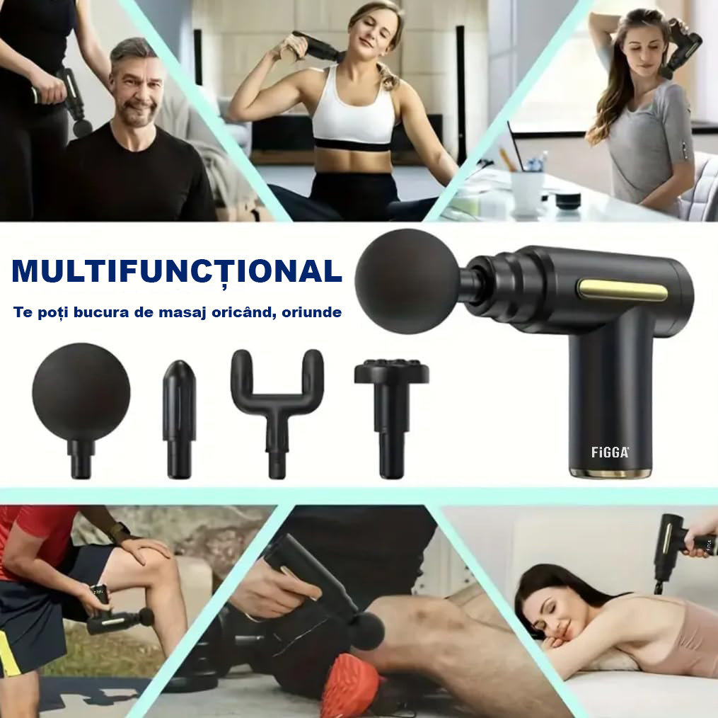 Massaggiatore Professionale FiGGA®, tipo pistola, batteria 2800mAh, 1800-3200 rpm, 4 teste, per collo, schiena, mani, gambe, anticellulite, motore silenzioso, colore nero.