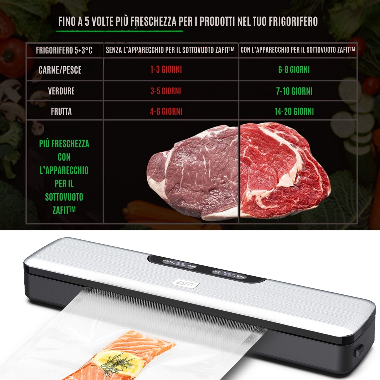 Con il nuovo apparecchio per il confezionamento sottovuoto ZAFIT™ VID-125 Professional, con accessori inclusi come tubo per sottovuoto per bottiglie e vaschette, tappo per bottiglie, gli alimenti possono essere conservati freschi fino a 5 volte più a lungo.