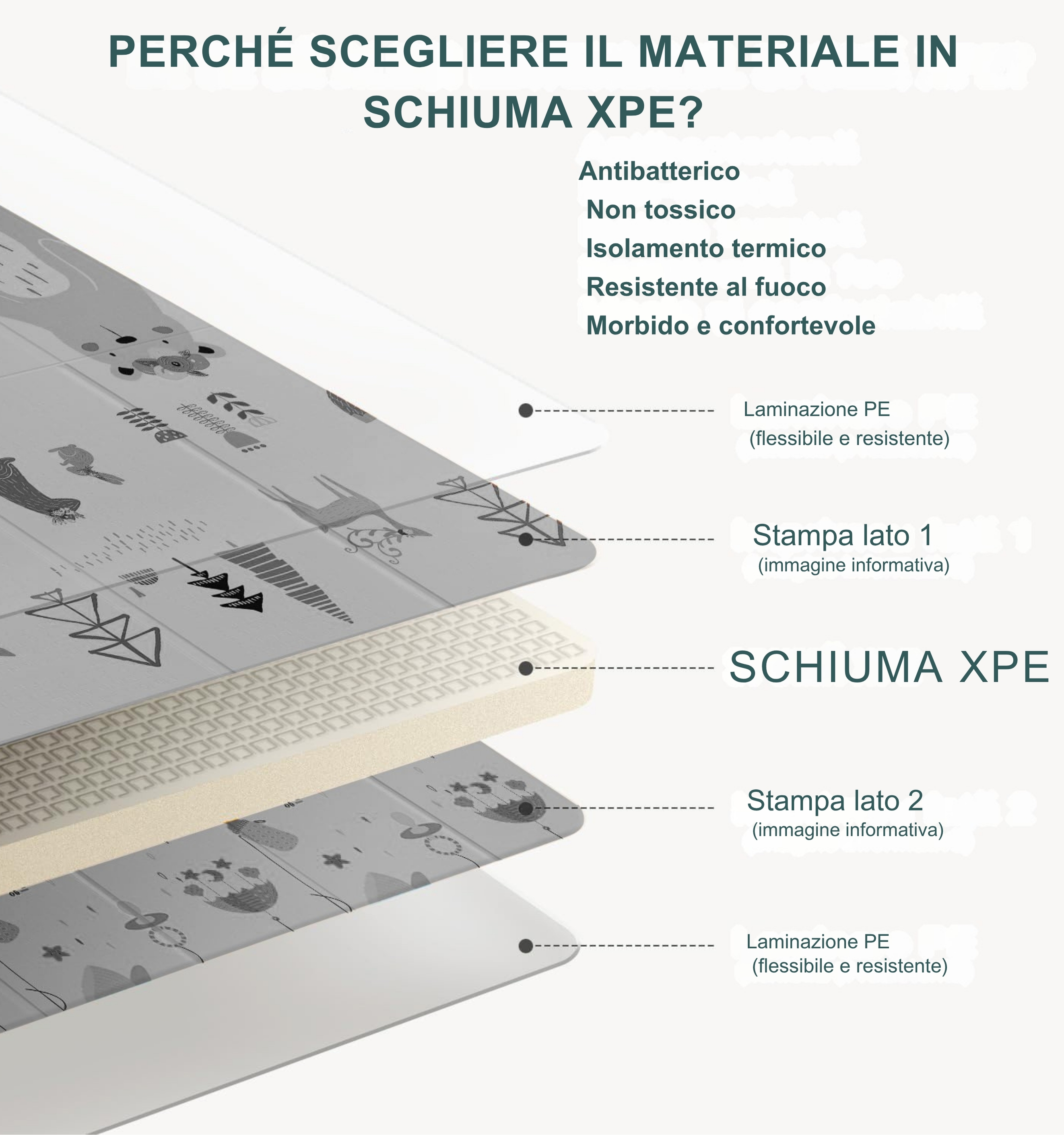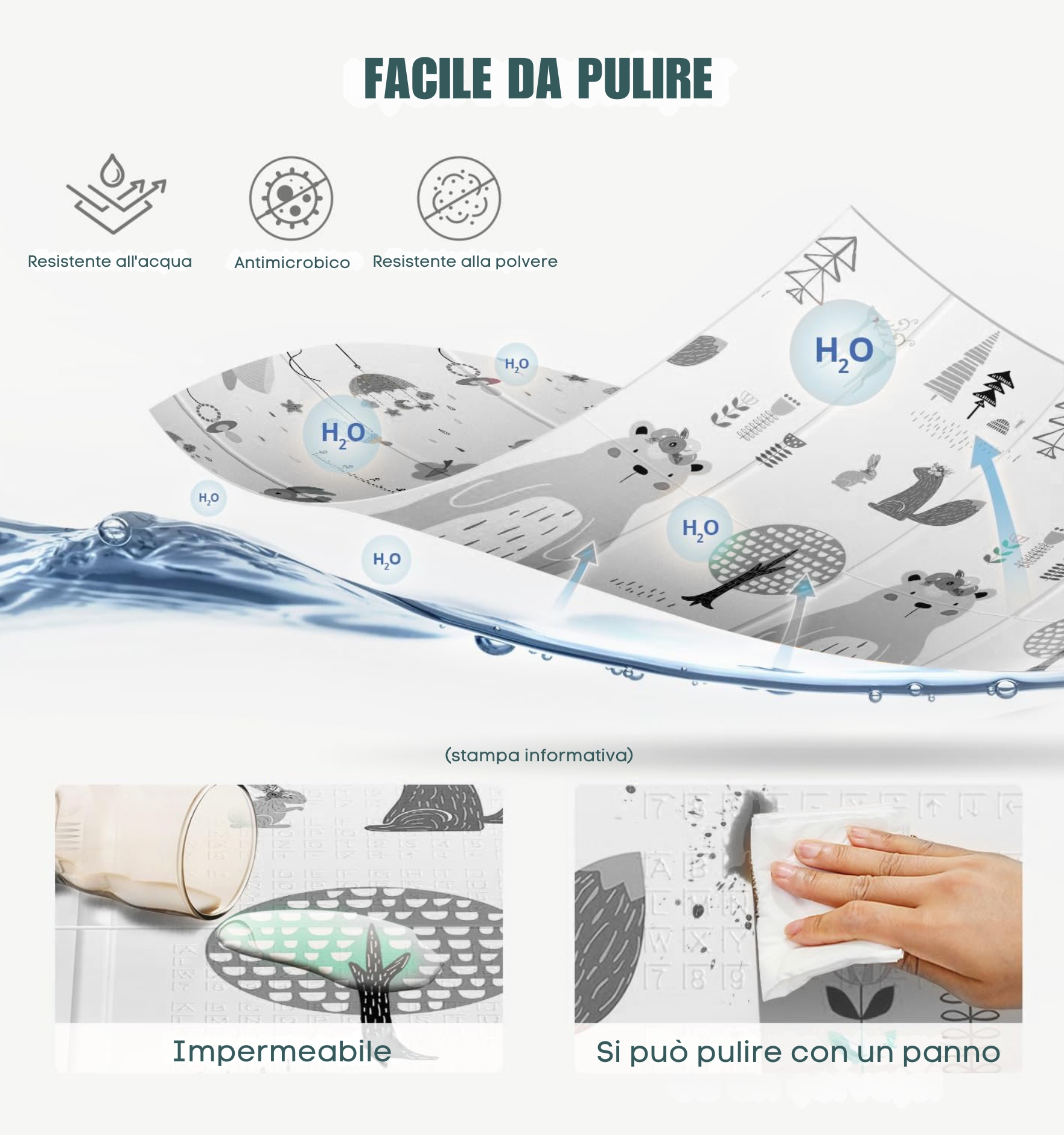 Isolamento termico: Garantisce un perfetto isolamento termico, proteggendo il bambino dal pavimento freddo durante il gioco.