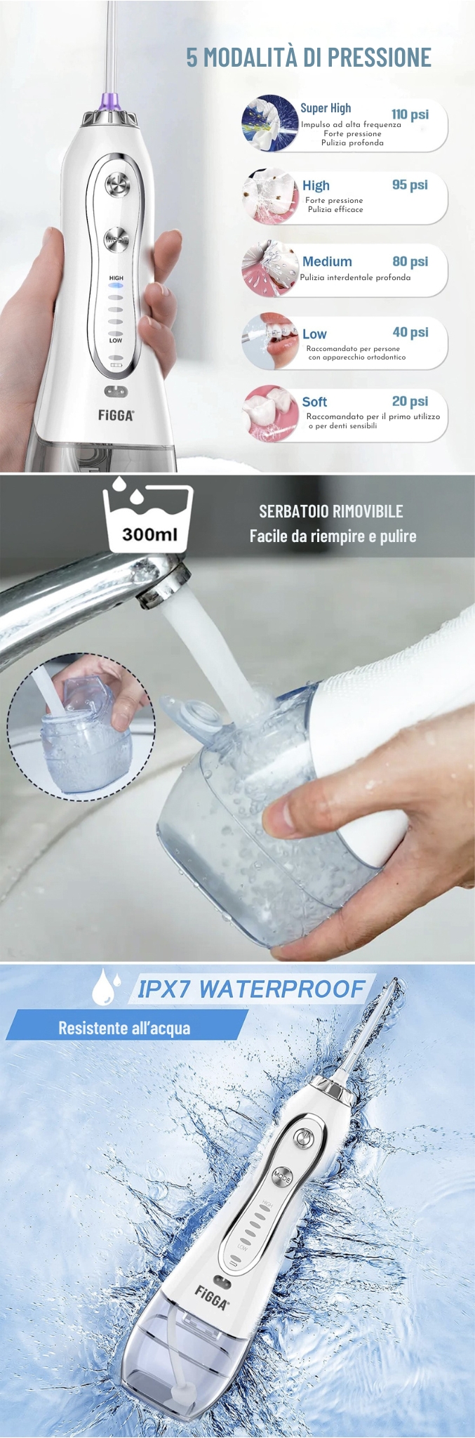 Doccia orale FiGGA® Oral-F101, irrigatore portatile professionale, 8 testine, batteria 2500 mAh, 5 velocità, serbatoio 300 ml, certificazione IPX7 Waterproof, protezione surriscaldamento, custodia per