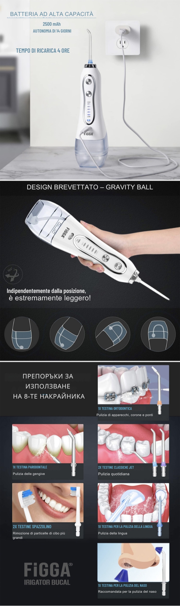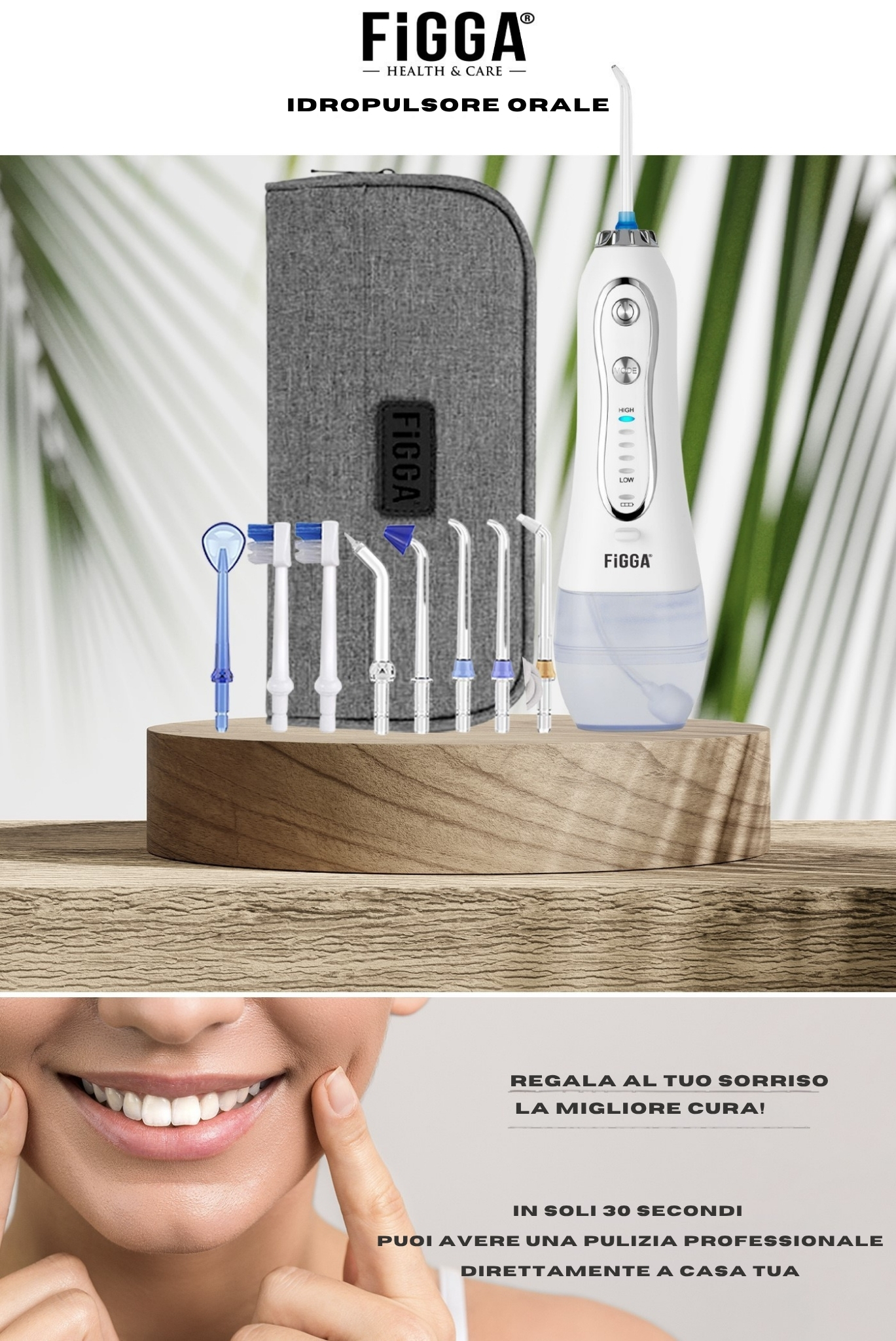 Doccia orale FiGGA® Oral-F101 – irrigatore portatile professionale progettato per un’igiene orale superiore e una cura completa della cavità orale. Questo dispositivo innovativo è dotato di 8 testine intercambiabili per una pulizia efficace e personalizzata, adattata alle tue esigenze specifiche.