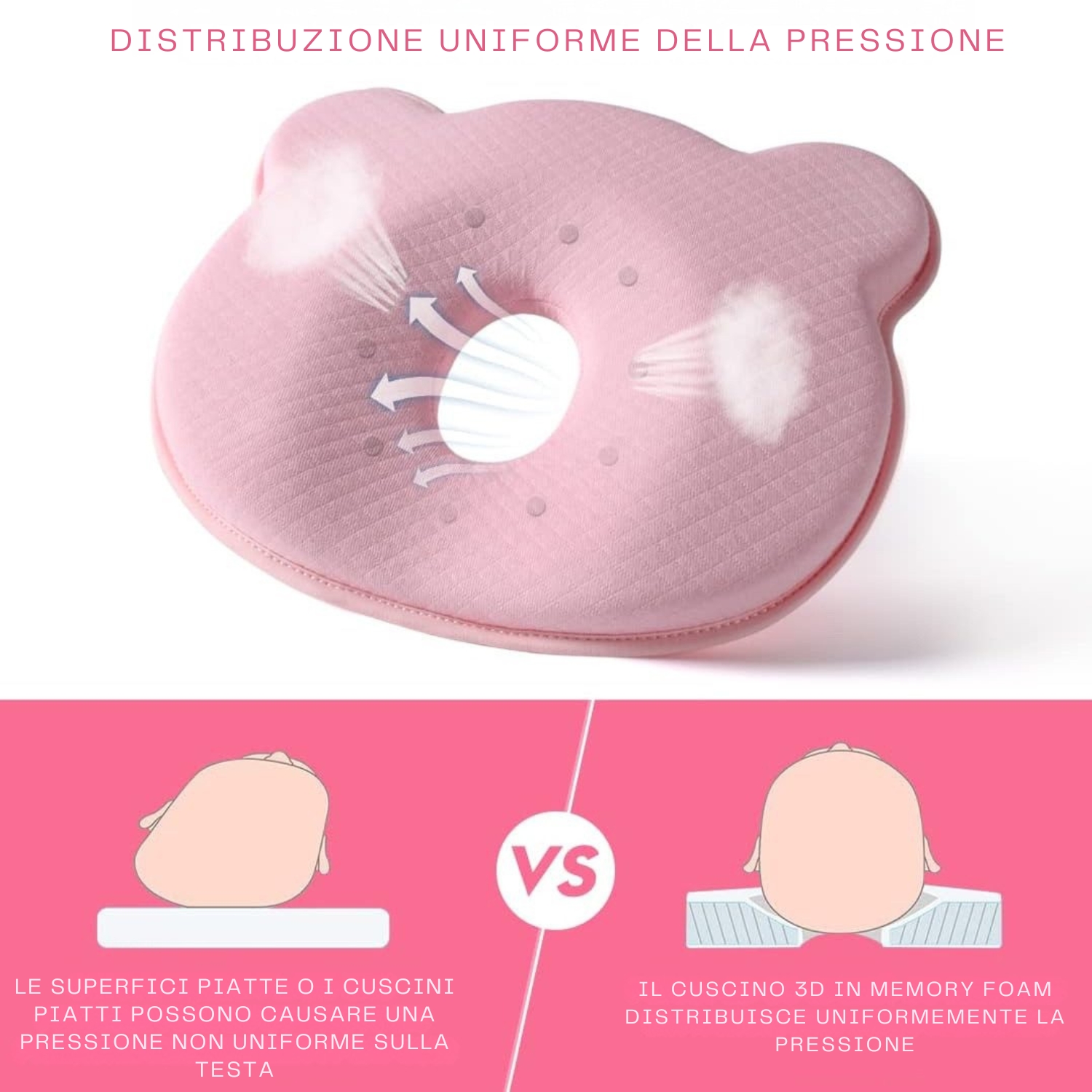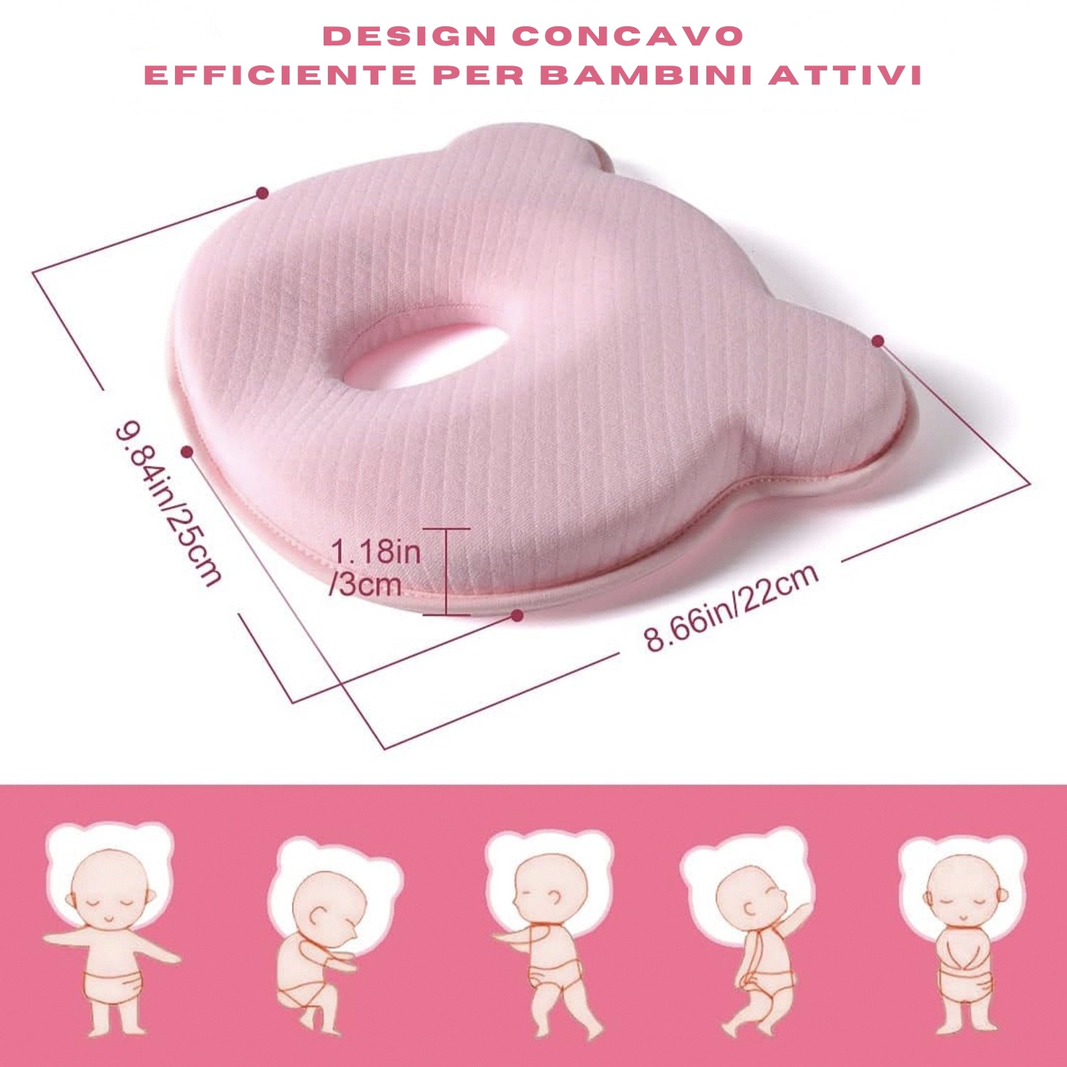 Design ergonomico: Il cuscino è progettato per distribuire uniformemente la pressione sulla superficie della testa del neonato, prevenendo le deformazioni.