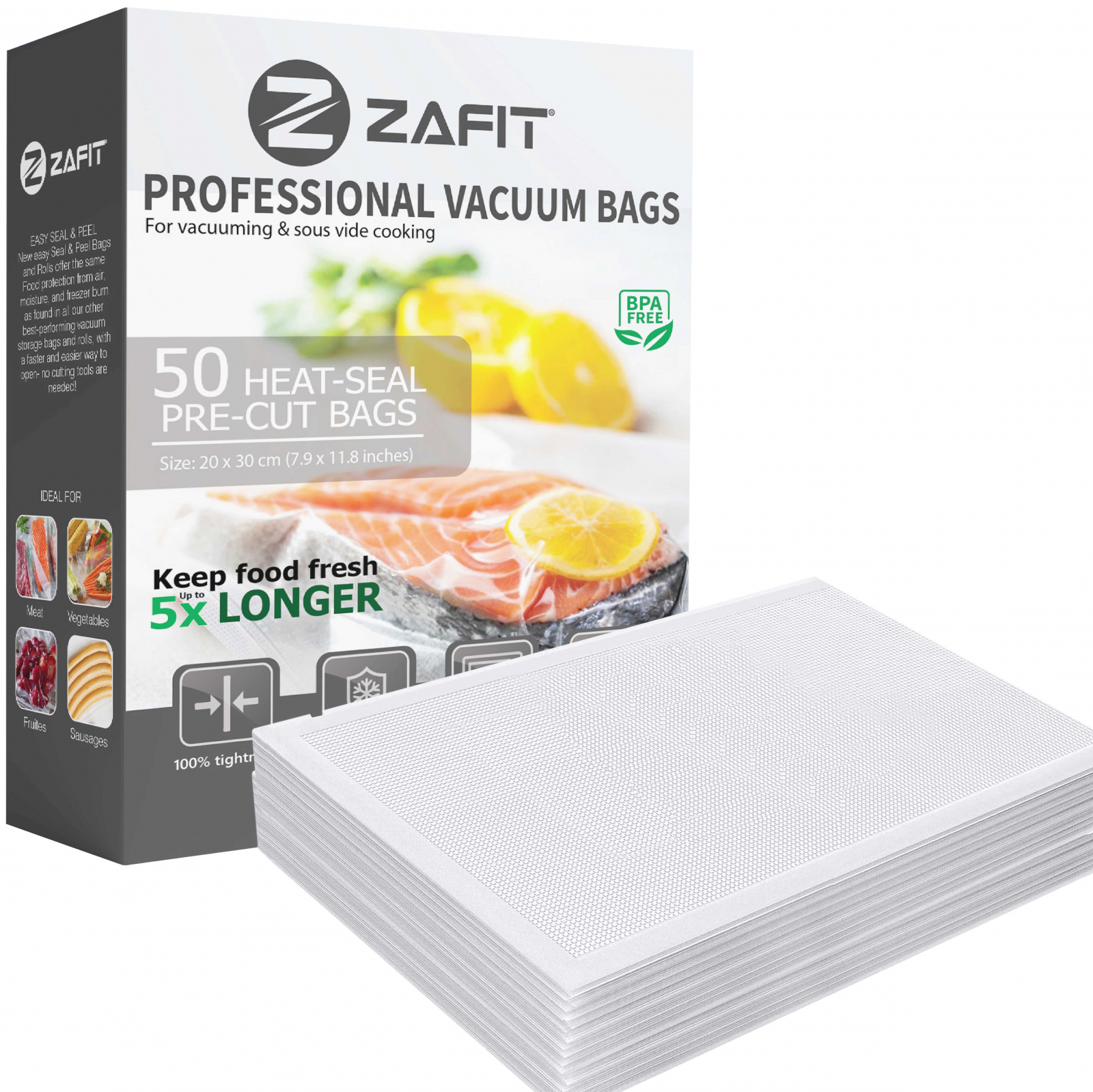 Sacchetti per sottovuoto goffrati ZAFIT™, per macchina sottovuoto alimentare, 50 pezzi, 20 x 30 cm, riutilizzabili, resistenti, sous vide, lavabili in lavastoviglie, senza BPA, trasparenti