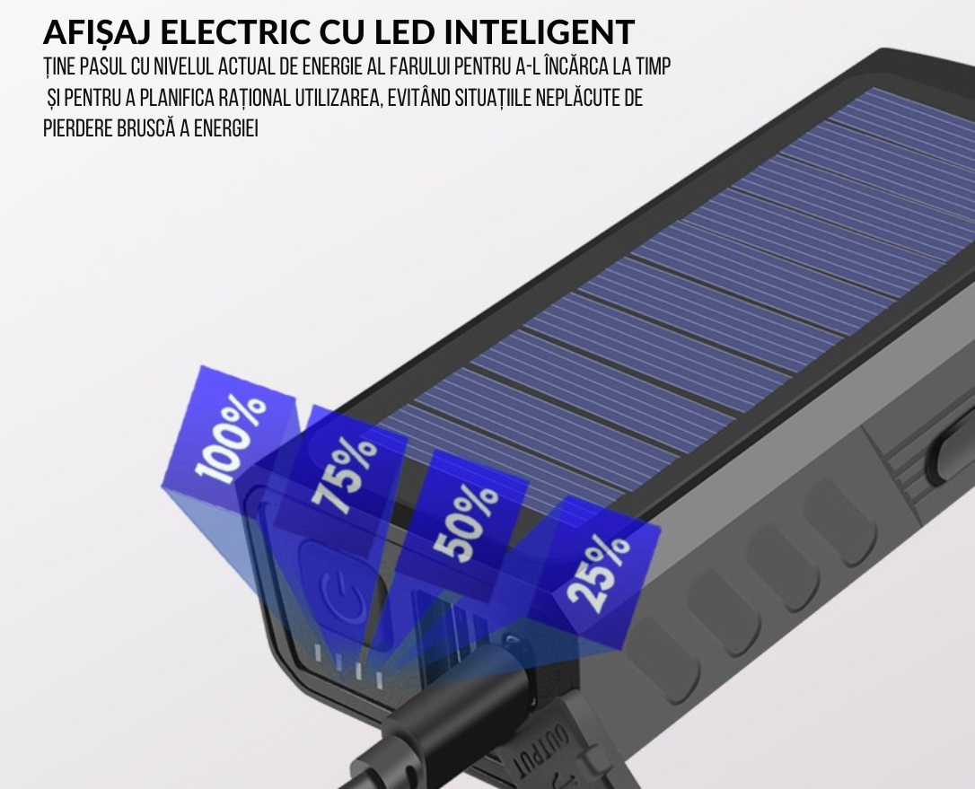 Lanterna este prevazuta cu un indicator de nivel al bateriei, astfel incat sa puteti vedea cata energie mai ramane in acumulator. Acest lucru va permite sa va planificati calatoriile si sa stiti cand este necesar sa incarcati din nou dispozitivul.