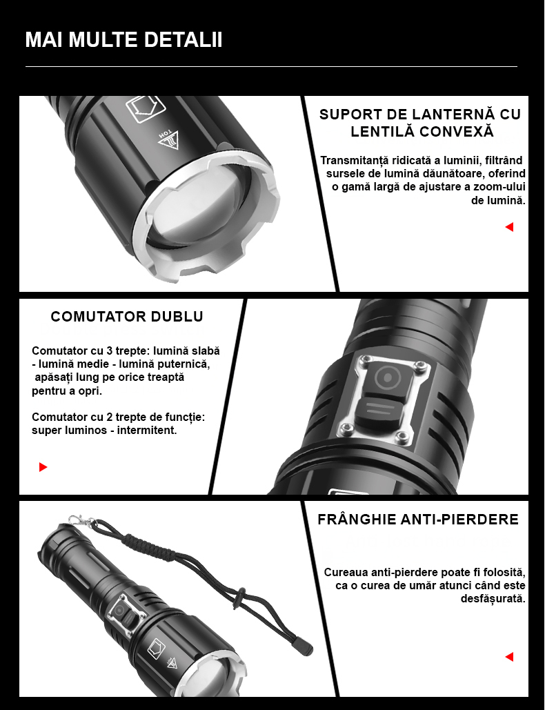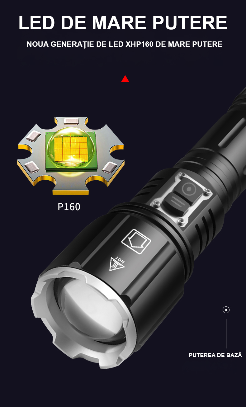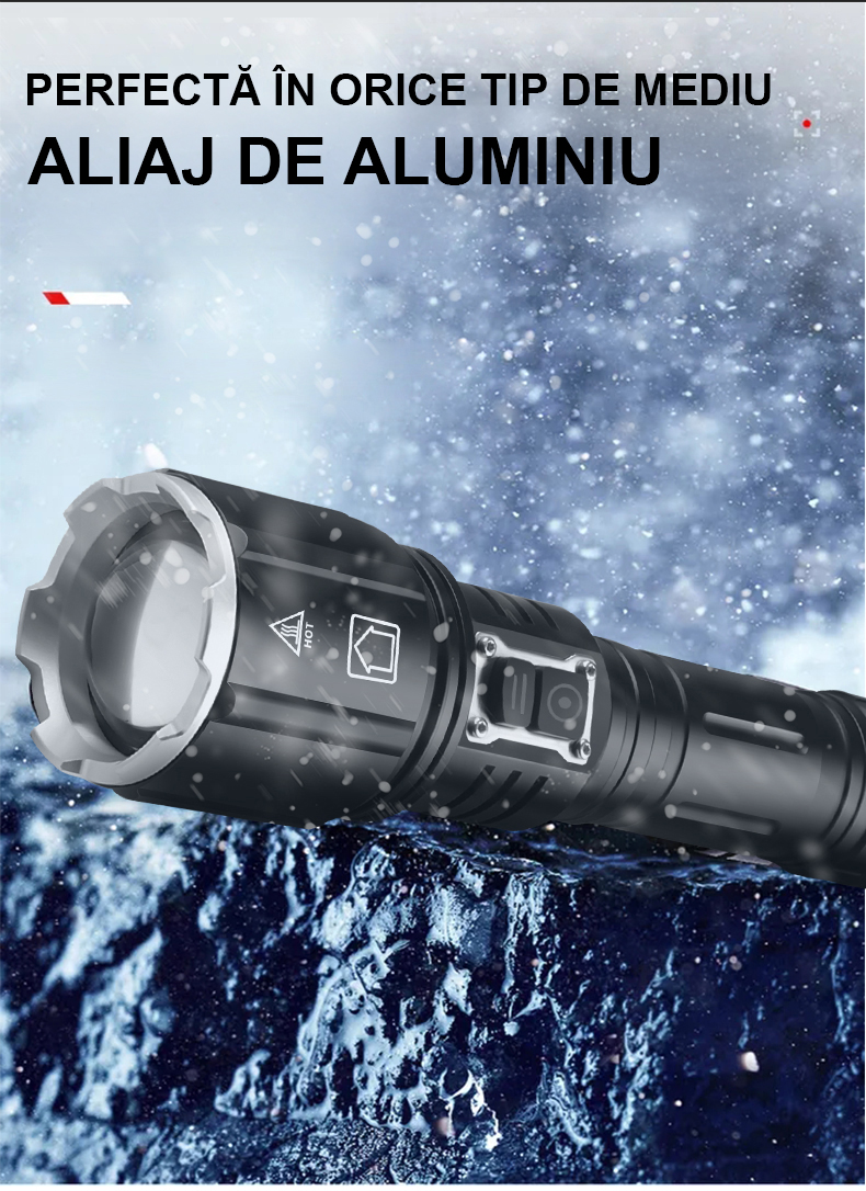 Cu o structura solida din aliaj de aluminiu de inalta calitate, lanterna noastra este proiectata sa reziste la uzura, socuri si impacturi accidentale. Indiferent de provocarile cu care te confrunti in natura, aceasta lanterna puternica iti va sta alaturi in toate aventurile tale.