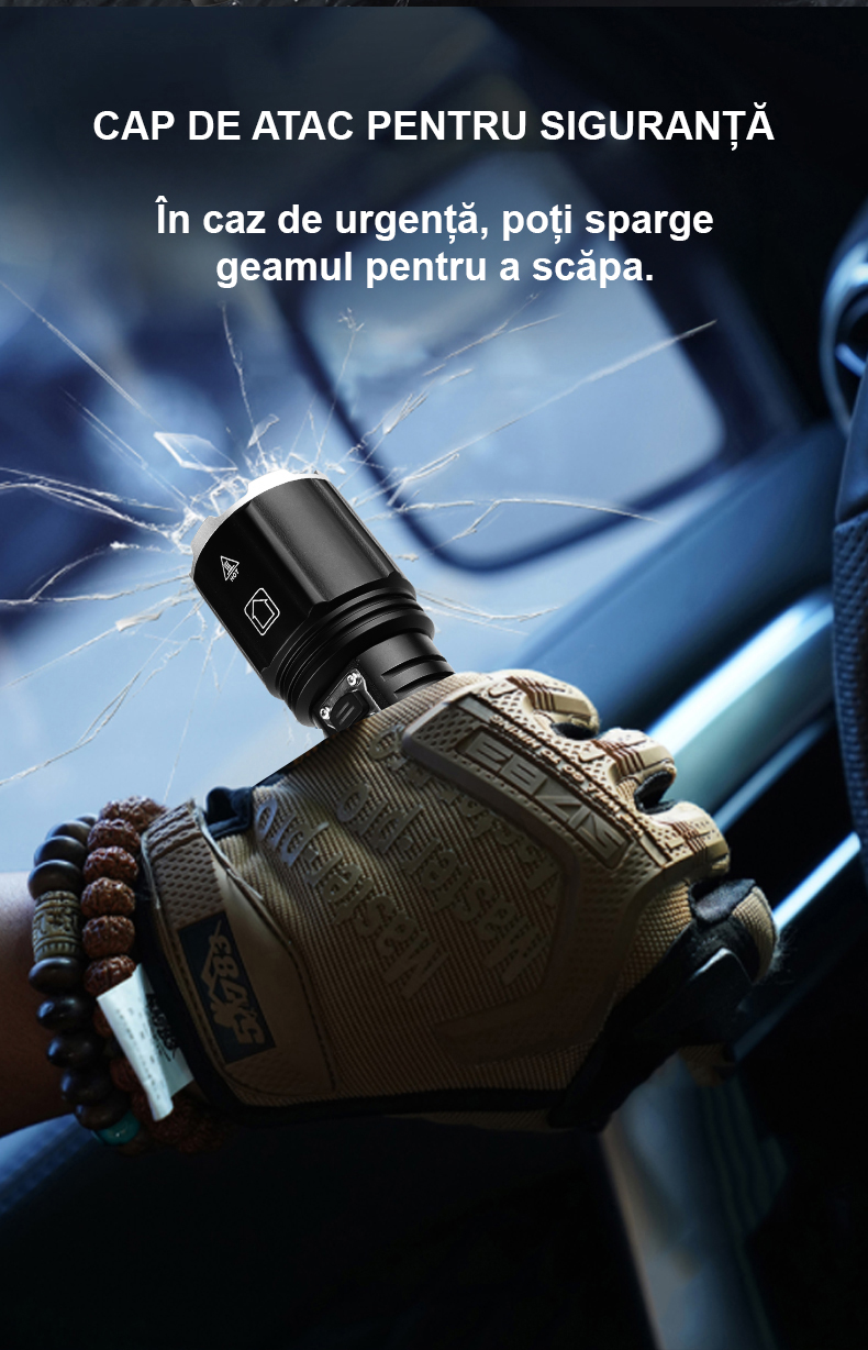 In caz de urgenta, lanterna dispune de un cap de siguranta special pentru situatii de urgenta. Fabricat din materiale rezistente, va permite sa spargeti ferestrele sau geamurile cu usurinta, oferind o cale de evacuare rapida atunci cand timpul este esential. Siguranta dumneavoastra este prioritatea noastra, iar aceasta functie adaugata va da putere sa luati masuri in situatii critice.