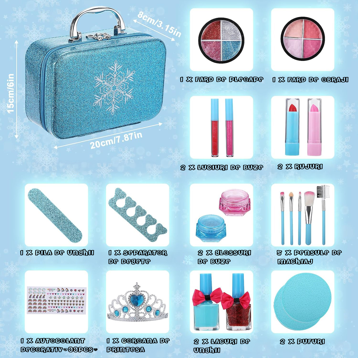 ❄ Machiaj sigur, non-toxic si lavabil - Siguranta este prioritatea principala a produselor pentru copii. Trusa noastra de machiaj este realizata din materiale de calitate, durabile, fara substante nocive. Pentru a indeparta machiajul, este suficient sa stergi excesul cu un servetel sau disc demachiant, apoi sa speli cu sapun, lotiune de curatare si apa calda. Astfel, micuta ta se poate bucura de frumusete fara griji!